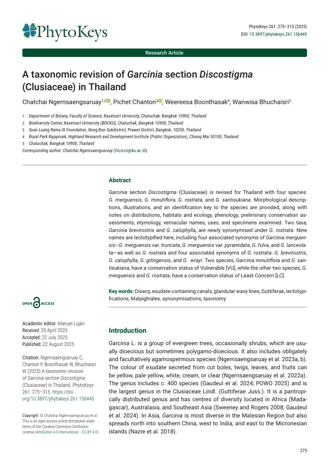 Abstract: Garcinia section Discostigma (Clusiaceae) is revised for Thailand with four species: G. merguensis, G. minutiflora, G. rostrata, and G. santisukiana. Morphological descriptions, illustrations, and an identification key to the species are provided, along with notes on distributions, habitats and ecology, phenology, preliminary conservation as-sessments, etymology, vernacular names, uses, and specimens examined. Two taxa, Garcinia brevirostris and G. calophylla, are newly synonymised under G. rostrata. Nine names are lectotypified here, including four associated synonyms of Garcinia merguensis–G. merguensis var. truncata, G. merguensis var. pyramidata, G. fulva, and G. lanceolata—as well as G. rostrata and four associated synonyms of G. rostrata: G. brevirostris, G. calophylla, G. gitingensis, and G. wrayi. Two species, Garcinia minutiflora and G. santisukiana, have a conservation status of Vulnerable [VU], while the other two species, G. merguensis and G. rostrata, have a conservation status of Least Concern [LC].